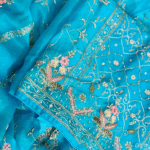Step into timeless elegance with our Nooraniyan ensemble, crafted on a luminous peacock blue organza base. This set features intricate hand embroidery using traditional Zardozi, Resham, and Dabka techniques, interwoven with delicate pastel florals and gold accents. The meticulous craftsmanship includes vines, ornamental motifs, and butterfly-inspired details, exuding regal grace.