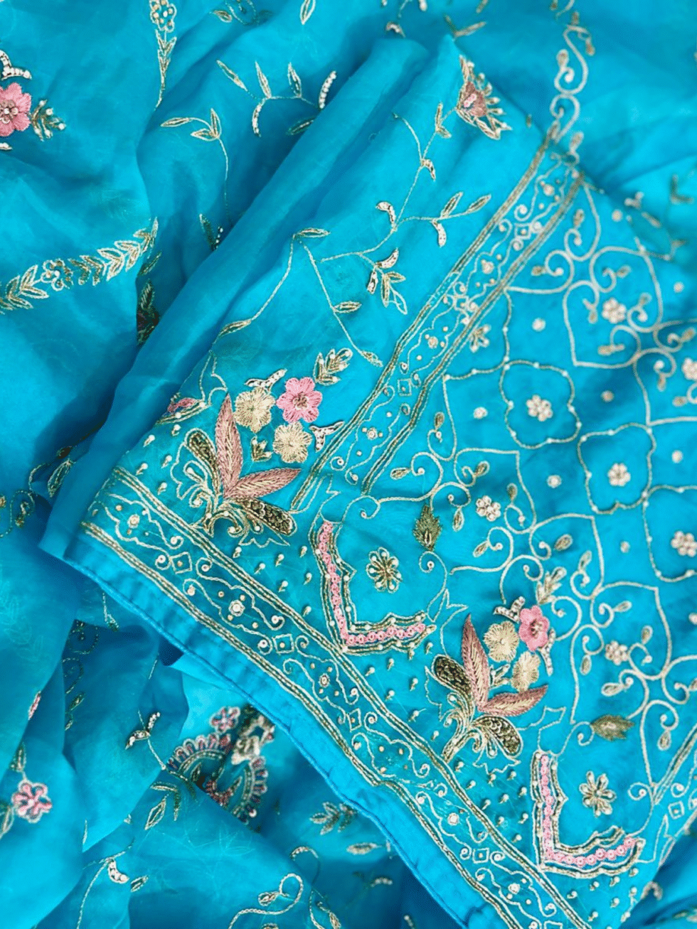 Luxe Peacock Blue Organza Ensemble with Zardozi & Resham Hand Embroidery