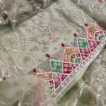 The highlight is the striking multicolor appliqué border, detailed with hand-embroidered florals in mirror-inspired geometric segments in shades of orange, pink, red, and green. The dupatta continues the charm with matching embroidery and a subtly scalloped edge, making it a delightful choice for festive mornings, day weddings, or spring celebrations.