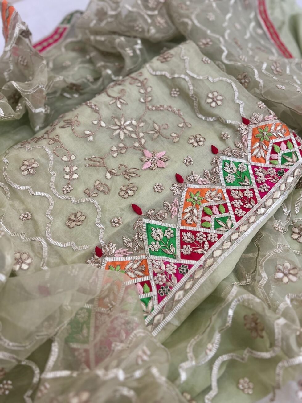 Pistachio Green Organza Ensemble with Mirror Appliqué